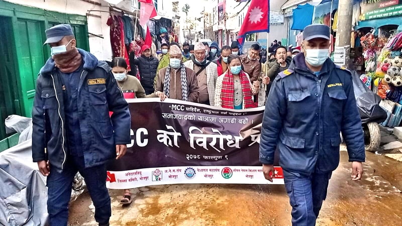 भोजपुर । अमेरिकन मिलिनियम च्यालेन्ज कर्पोरेशन (एमसिसि) को विरोधमा नेपाल कम्युनिष्ट पार्टी (एकीकृत समाजवादी) निकट भातृ संगठनहरुले जिल्लाका विभिन्न स्थानमा प्रदर्शन गरेका छन् । आईतबार नेकपा एस भोजपुरले एमसिसिको विरोधमा सदरमुकाम र दिङ्लाबजार क्षेत्रमा विरोध जुलुस गरेको हो ।