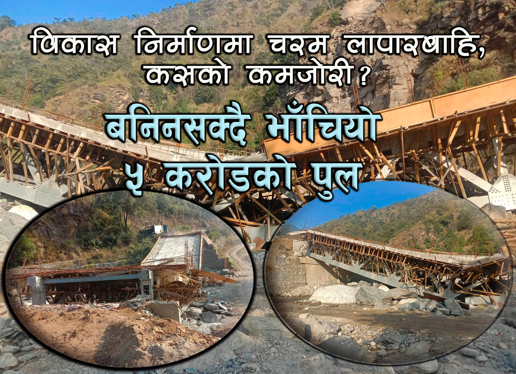“४५ मिटर लम्बाई र ६ मिटर चौडाई रहने उक्त पुल निर्माणका क्रममा विचैमा भाँचिएको थियो । डिजाइन अवधि ८० वर्ष र भूकम्प प्रतिरोधी रहने भनिएको उक्त पुल भाँचिएको ८ महिना वित्दापनि वेवास्ता गरिएको छ”