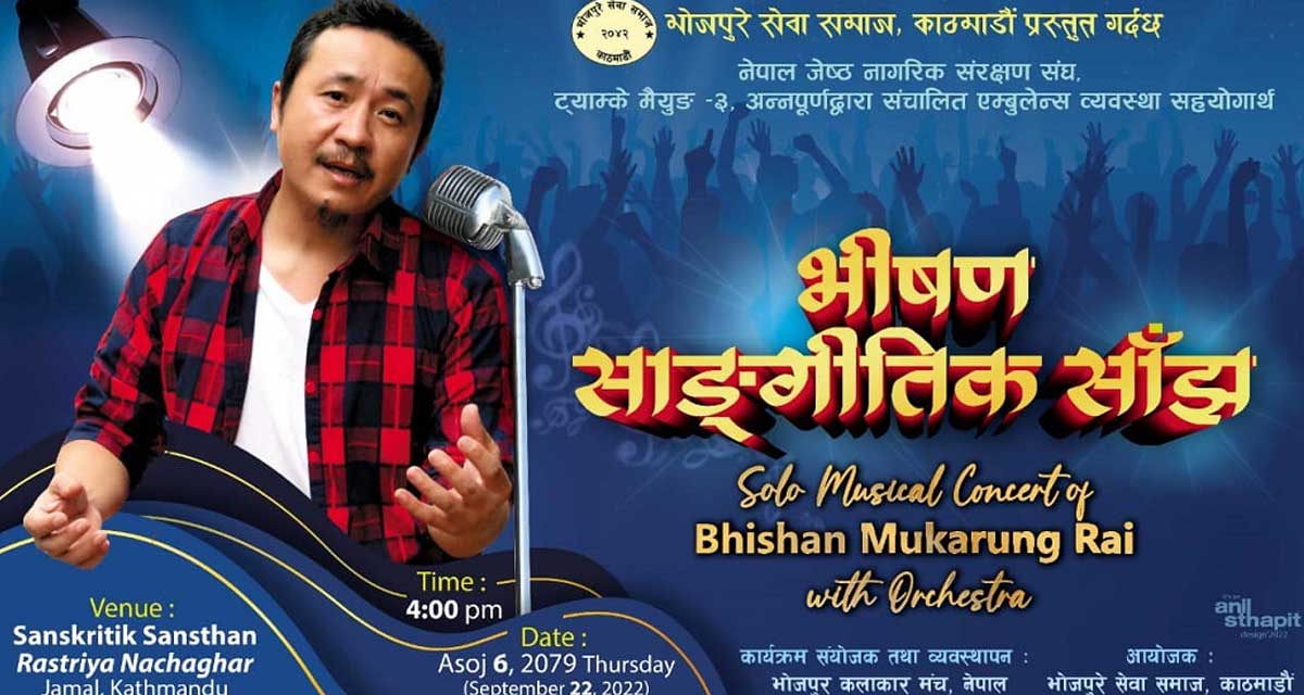 काठमाडौँ। एम्बुलेन्स संचालन सहयोगार्थ चर्चित गायक भिषण मुकारुङको एकल साँझ हुने भएको छ। असोज ६ गते बिहीबार सांगीतिक साँझ गर्न लागिएको हो। भोजपुरे सेवा समाज काठमाडौंले एकल साँझको आयोजना गर्न लागेको हो।