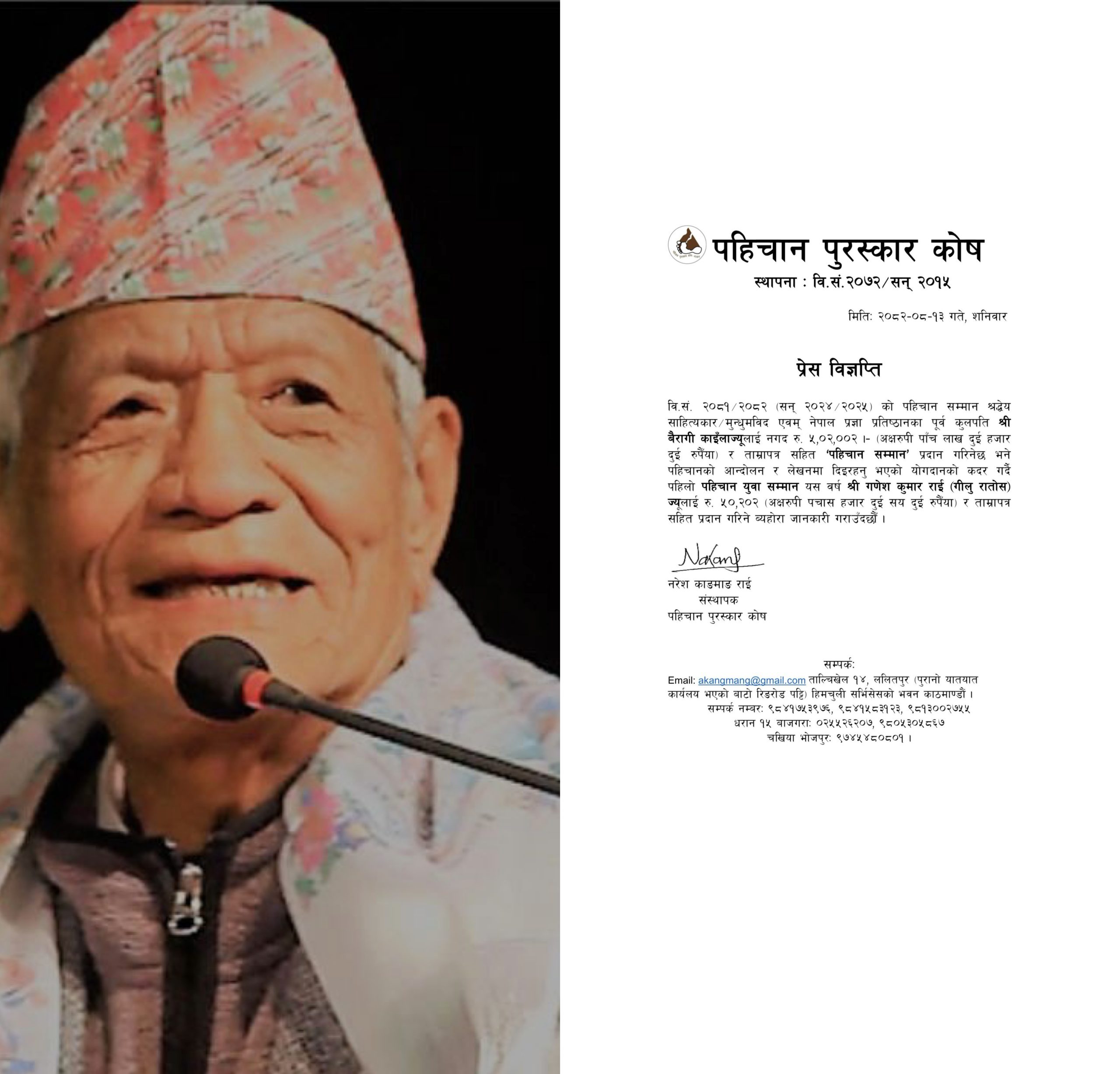 पहिचान पुरस्कार कोषले यसपटक वि.सं. २०८१/२०८२ को पहिचान सम्मान साहित्यकार, मुन्धुमविद एवम् नेपाल प्रज्ञा प्रतिष्ठानका पूर्व कुलपति श्री बैरागी काइँलालाई नगद ५ लाख २ हजार दुई सय र ताम्रापत्र सहित पहिचान सम्मान प्रदान गर्ने भएको हो । त्यसैगरी पहिचानको आन्दोलन र लेखनबाट पहिचानमा योगदान दिदै आएका गणेश कुमार राईलाई ५० हजार २ सय दुई रूपैया र ताम्रापत्र सहित प्रदान गरिने पहिचान पुरस्कार कोषले प्रेस विज्ञप्ति मार्फत जनाएको छ ।